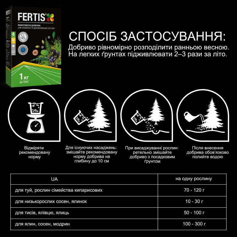 | для тисів, ялівців та ялиць | 50-100 | розсипаємо навколо рослини на відстані 50-70 см або робимо кілька лунок на тій самій відстані та насипаємо добриво |